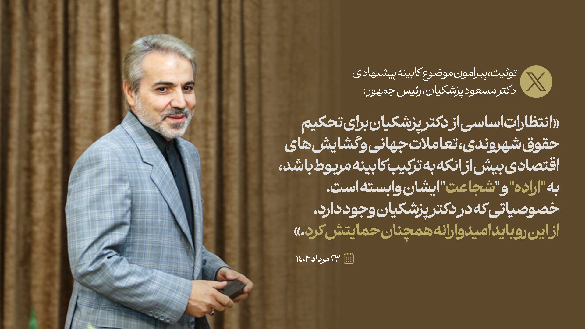 «انتظارات اساسی از دکتر پزشکیان برای تحکیم حقوق شهروندی، تعاملات جهانی و گشایش های اقتصادی بیش از انکه به ترکیب کابینه مربوط باشد ، به “اراده” و “شجاعت” ایشان وابسته است. خصوصیاتی که در دکتر پزشکیان وجود دارد. از این رو باید امیدوارانه همچنان حمایتش کرد.»